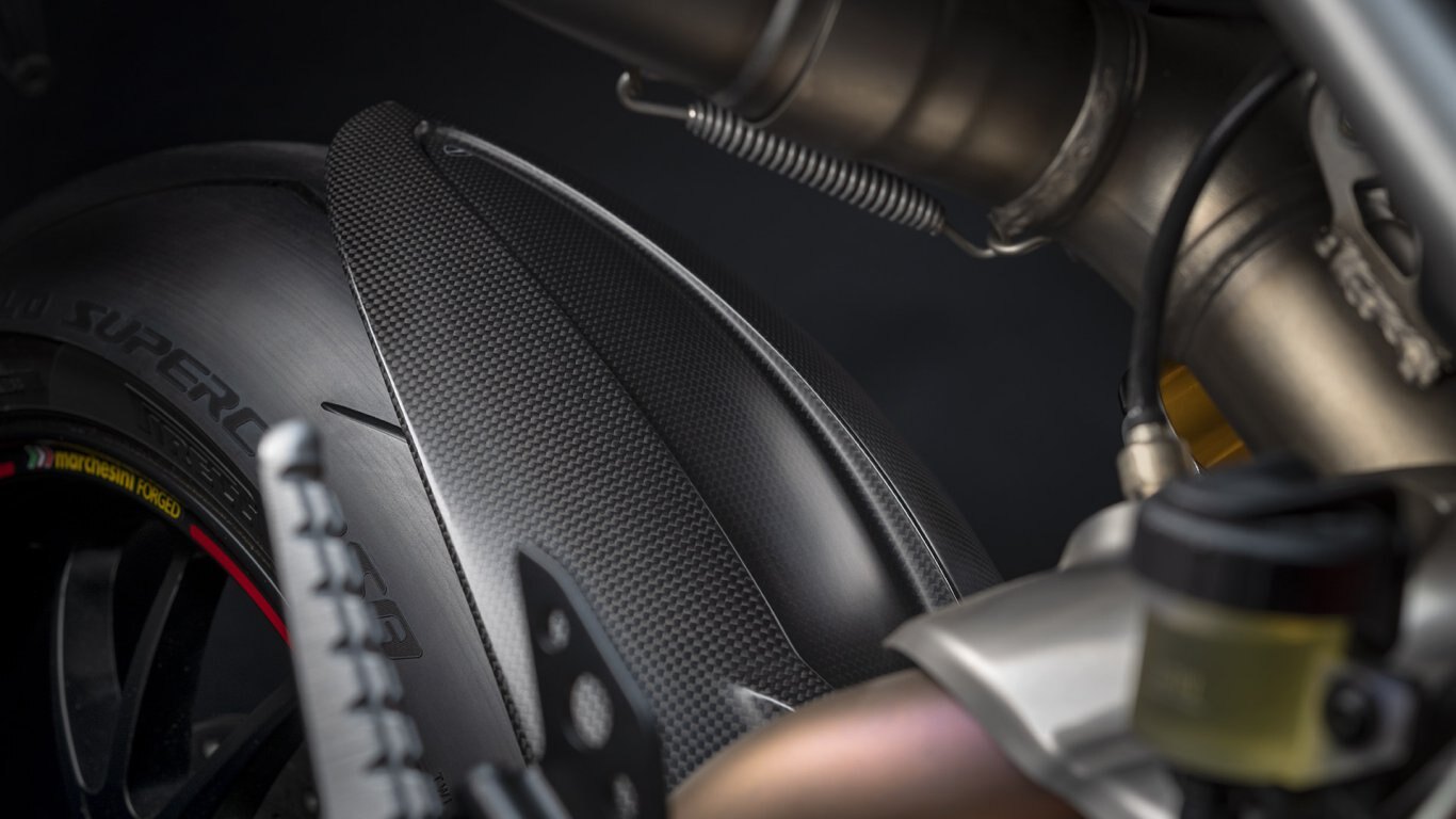 The Hypermotard 950 and RVE are equipped with a Marzocchi fork with fully adjustable 45 mm aluminum tubes and stanchions, with 170 mm wheel travel. At the rear is an adjustable Sachs shock absorber with 150 mm wheel travel. The Hypermotard 950 SP is equipped with a fully adjustable 48 mm Öhlins fork with 185 mm wheel travel and a fully adjustable Öhlins shock absorber with 175 mm wheel travel.