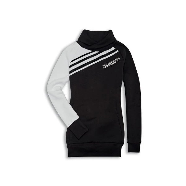 Women's sweatshirt with an evident wraparound collar. Made of pure cotton, it has front pockets. Prints that create a strong link with the past. 77, the year that the logo designed by Giorgetto Giugiaro assumed its definitive look.