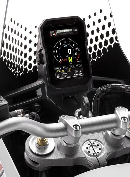 6 riding modes, a 5” color TFT display, and full LED lights. Like all Ducatis, DesertX flaunts advanced electronic equipment to ensure safety and performance in all conditions.