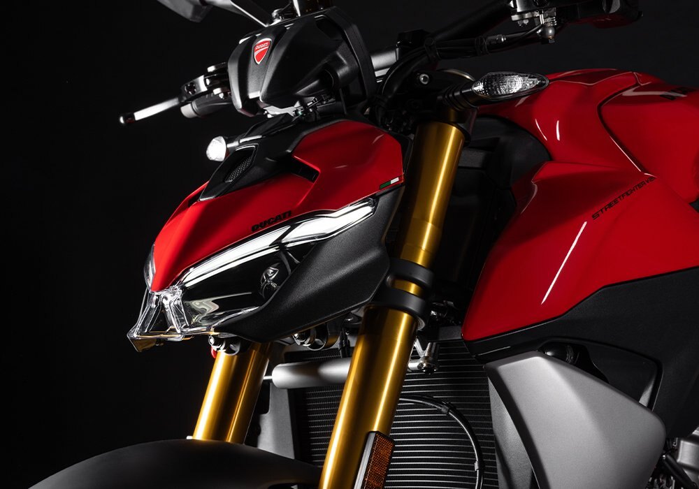 Redesigned front end with new full LED headlightThe front end is clean and essential, drawing attention to the brand-new full LED headlight, which takes an already iconic design and makes it even more current and technological. The DRL contributes to creating an immediately recognizable profile, the fierce look embodying the true essence of the Streetfighter. |
