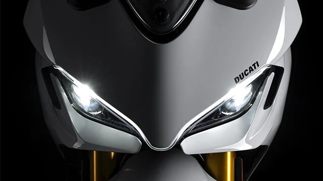 The DRL has a refined construction with an opal that diffuses the light evenly. The headlamp is completed by two twin-function LED modules for low beam and high beam that allow the bike to have a symmetrical “look” with the lights on that recalls the sharp light signature of the Panigale V4.