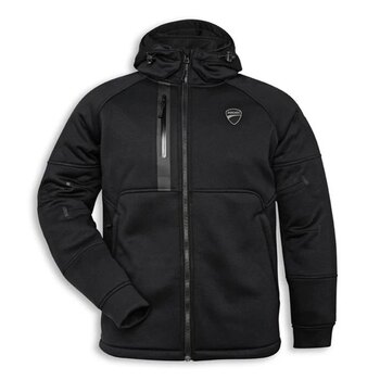 A sophisticated technical sweatshirt designed by Aldo Drudi and developed by Spidi exclusively for Ducati. CE-certified, the traditional riding apparel protective elements in the shoulders and elbows are integrated into this item, for a minimal and decisively urban look. The cotton-feel stretch polyamide and micro-fleece exterior matches with the mesh inner liner, the aramid fiber anti-abrasion supports and Keramide inserts in the shoulders, elbows and back. Maximum comfort and practicality for your daily commute thanks to the waterproof inside pocket, two outer pockets and the right front smartphone pocket. The removable hood and the pocket designed to insert the back protector make this sweatshirt highly versatile and suitable for a short ride out of town. The ideal item to ride in the perfect Ducati style.