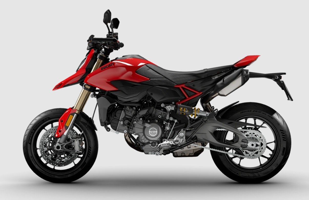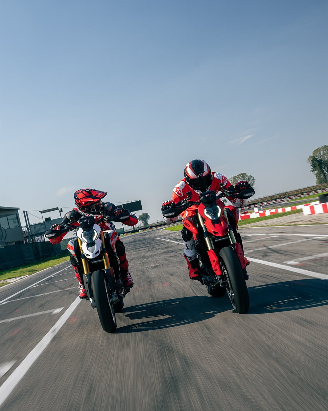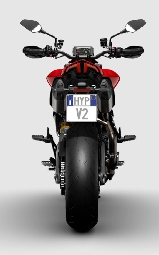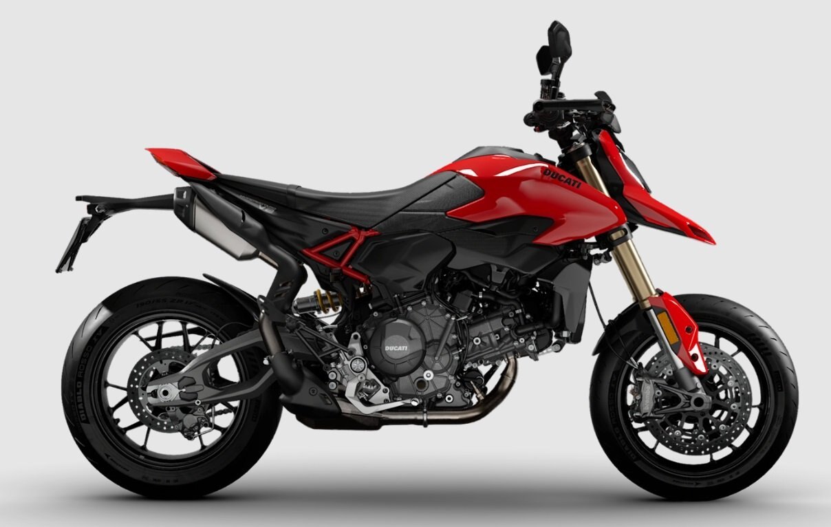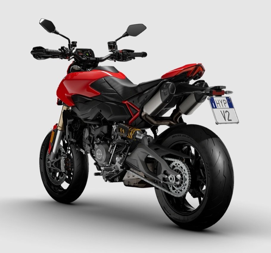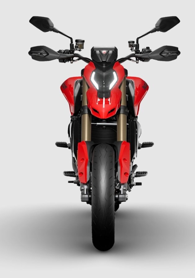 The new Hypermotard V2 range mounts aluminium wheels with a Y-shaped six-spoke design, paired with Pirelli Diablo Rosso IV tyres measuring 120/70 and 190/55. The SP version adopts forged wheels that are 1.5 kg lighter.